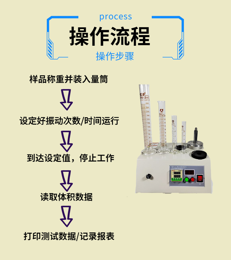 1.振實密度測定儀的工作方式:通過機械震動的方式對裝有粉末樣品的量筒進行固定頻率和振幅的敲擊,直至樣品在量筒中密實而不在下降為止,在通過密度計算公式,質量與體積之比獲得.