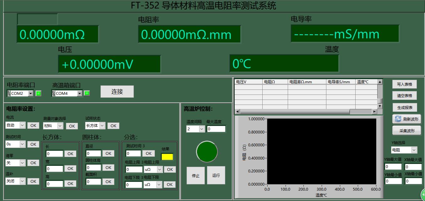 導(dǎo)體材料的電導(dǎo)率對(duì)溫度變化測(cè)量要求,測(cè)控軟件實(shí)時(shí)繪制出溫度與電阻,電阻率,電導(dǎo)率數(shù)據(jù)的變化曲線圖譜,及過(guò)程數(shù)據(jù)值的報(bào)表分析.具有氣氛保護(hù)功能.