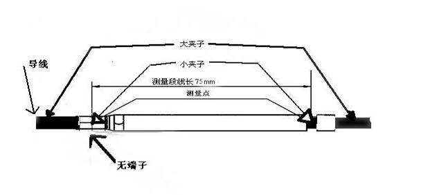 如上示兩圖中,圖1導線首端帶有端子,測量75mm長帶端子導線的兩端壓降,記錄數據備用;圖2中導線不帶端子,直接測量75mm長導線的兩端壓降,記錄數據;用圖1中測得的壓降減去圖2中測得的壓降即為被測端子的壓降。