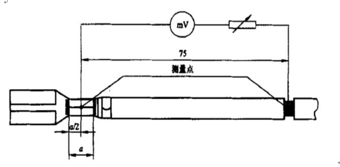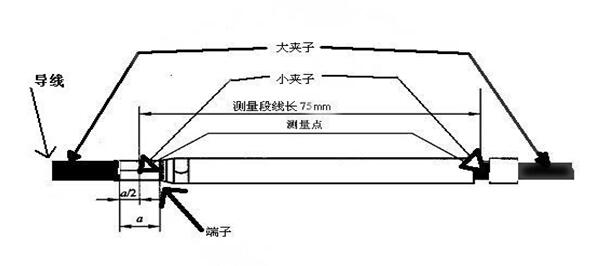 如上示兩圖中,圖1導線首端帶有端子,測量75mm長帶端子導線的兩端壓降,記錄數(shù)據(jù)備用;圖2中導線不帶端子,直接測量75mm長導線的兩端壓降,記錄數(shù)據(jù);,用圖1中測得的壓降減去圖2中測得的壓降即為被測端子的壓降。